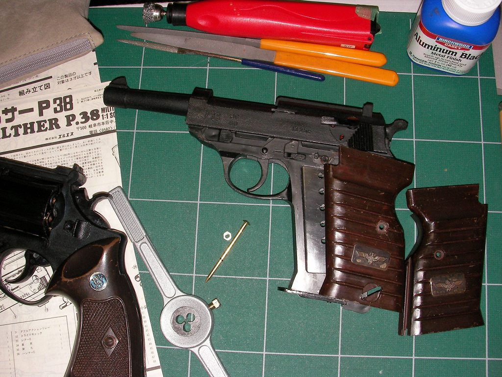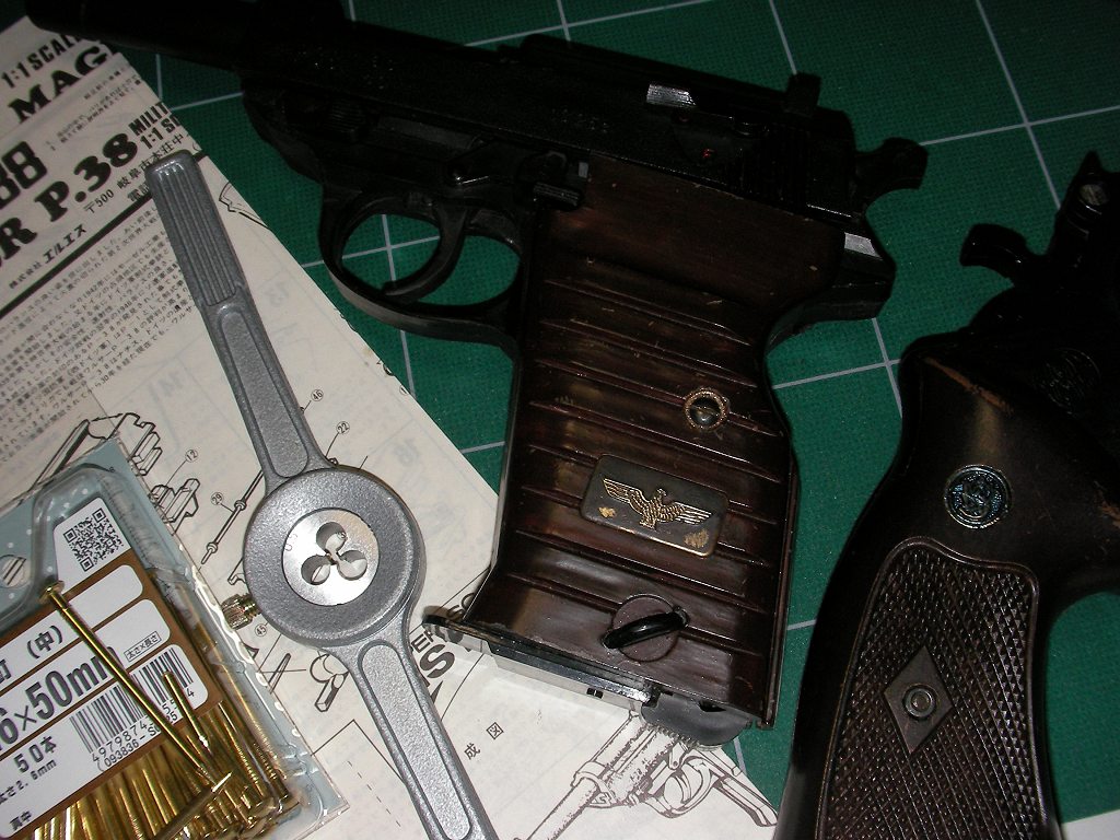 初期エルエス(LS)プラモデルガンのワルサーP.38を某オークション(確実にバレてますね)にて入手した。大変親切な方で一切合切、とくに初期絶版の共通カートタイプで知られているP.38シークレットエージェントとコンバットマグナムまで譲って戴いたという訳。いずれも時代的に金型設計と成型の具合が芳しくなかったためか、ラインナップ上では最も玩具然とした仕上がりとなっている。そのため人気も賛否分かれると聞くが、なかなかどうして良く雰囲気を掴んでいると思う。
