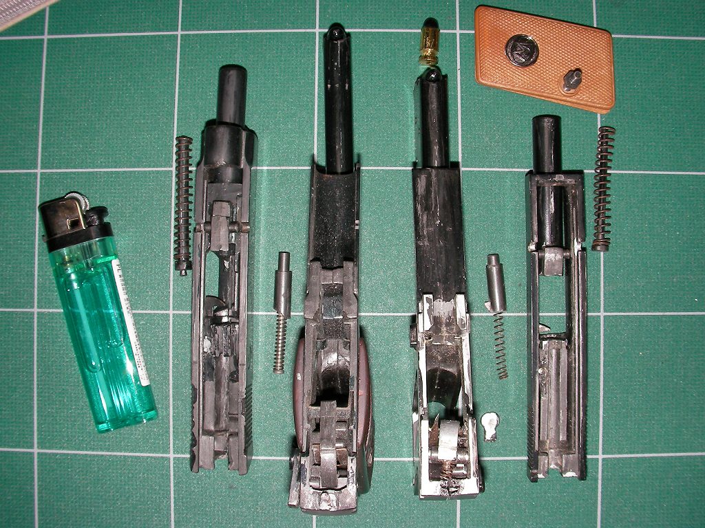 まず最初にワルサーの方の面倒をみようといろいろいじっていたら、「パカリ」と割れてしまった。ポーランド語のWikipediaのサイトにWalther Model.9の記事があり、実銃は長さが4インチ、高さ3インチに満たないとても小さい銃だということが分かる。それの内部機構を旧国際.25オートライクにした組み立てモデルに実現してしまったのは凄いことだが、いかにも接着エリアや部品の強度になにかと不安がありそうな小ささである。