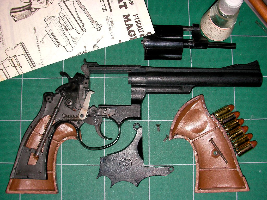 入手したS&Wコンバットマグナムをフィールドストリッピングしてみた。3.5inchモデルの取説が敷いてある。共通カート6発はピカピカだ。グリップスクリュウは真鍮釘からリプロした物。