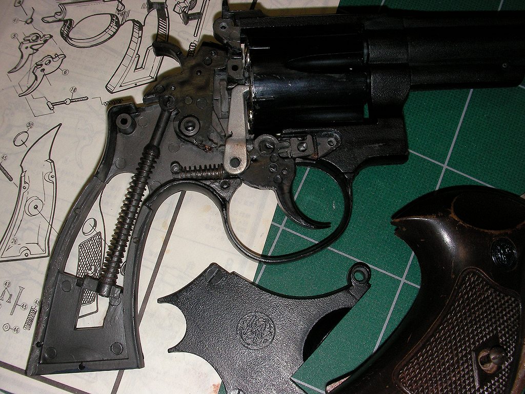 アクションを確実にするコイルスプリングで、亜鉛メッキの金属製シリンダーハンドと相まって全体にモデルガン然としている。良く見ると通常のモデルガンをさらに簡略化していて、シリンダーストップのノッチは凸形状になっている。S&Wのロゴやマーキングも凸線だ。
